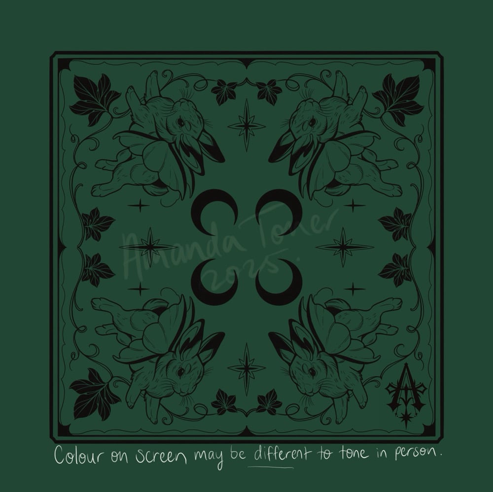 Medium sized cloth bandana with fairy rabbit and ivy design. Can be used as a bandana, scarf, bag accessory, altar cloth or a piece for your wall. One side printed, a deep emerald/forestry green tone, colour may appear different on screen and photo lighting.Polyester, white fabric backside.